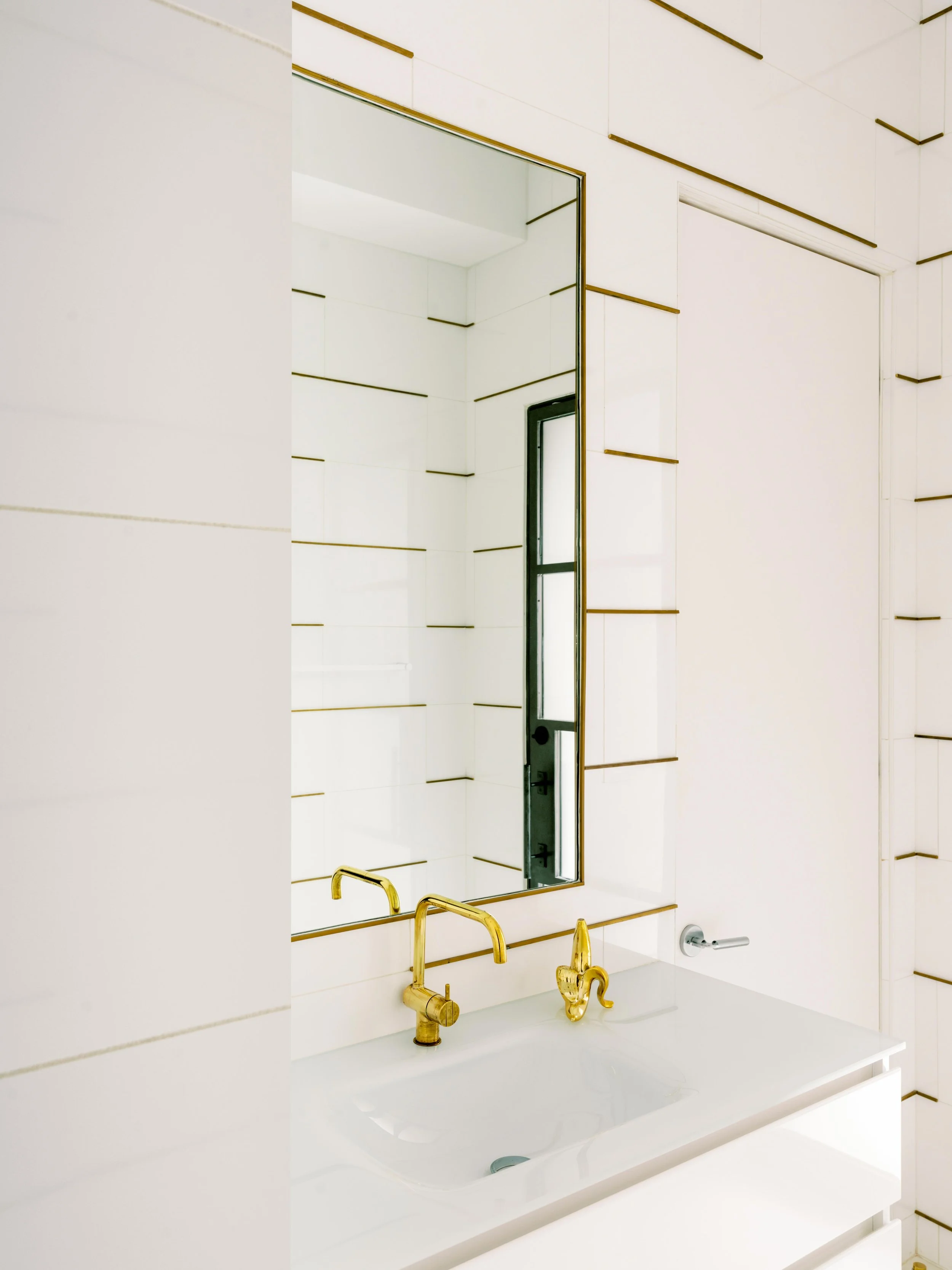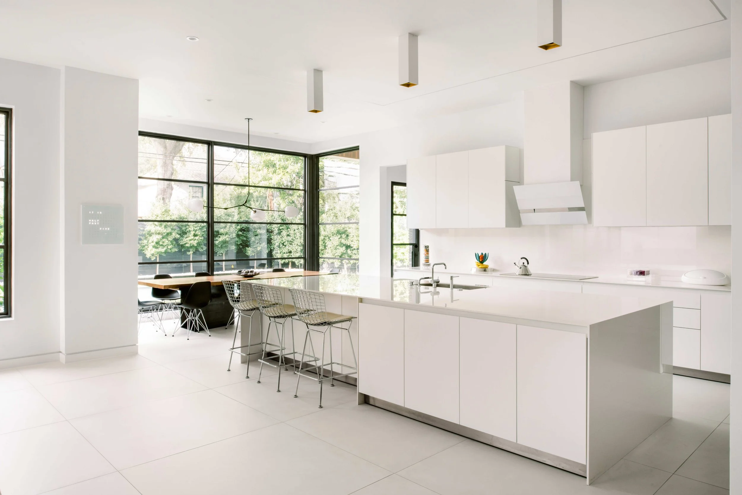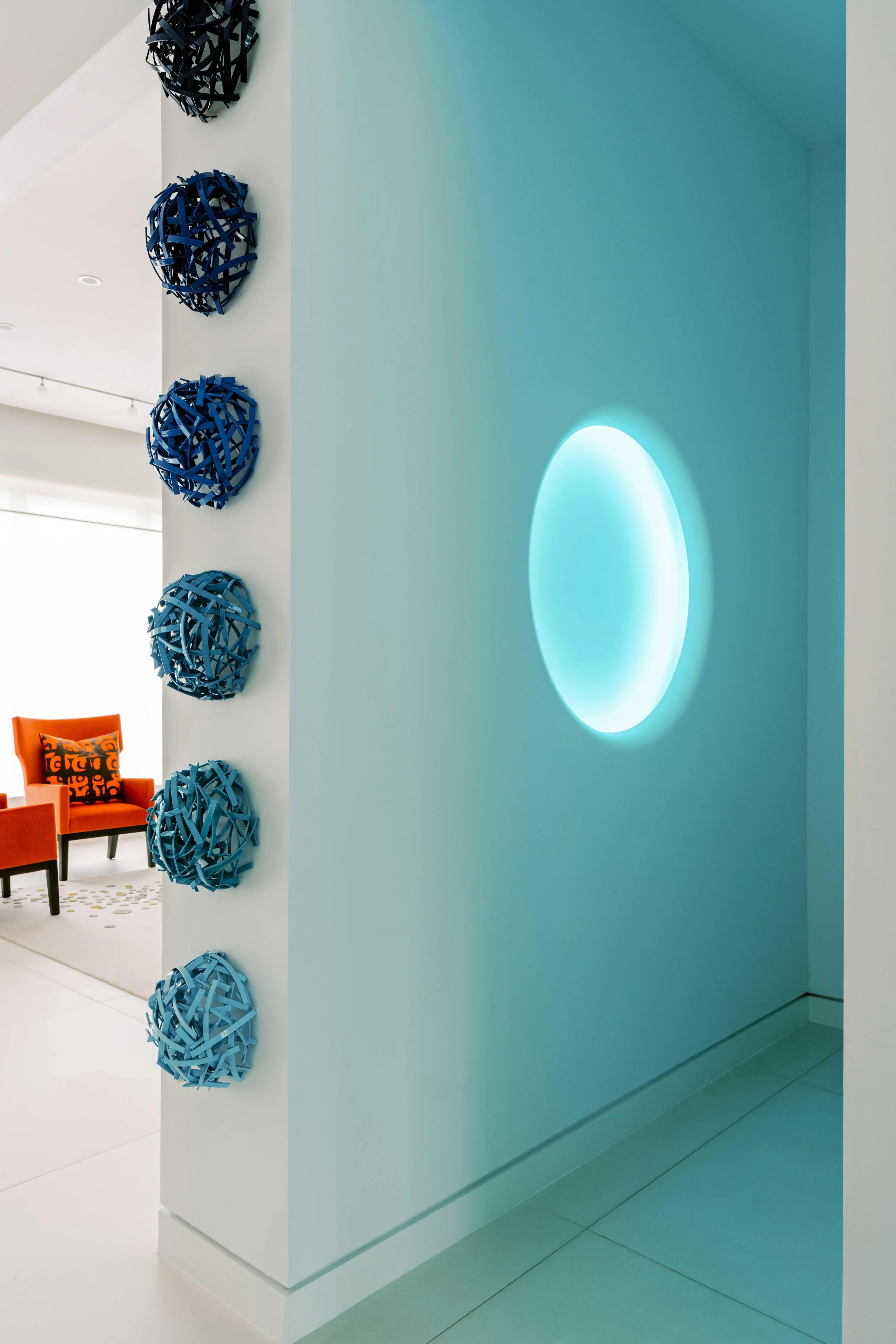 Pop Palace is a ground-up, two-year project by Lambrakos Studio to create a singular space for an art-collecting family. Our firm designed the interior architecture, selected interior and exterior finishes, fixtures and furnishings. Pop Palace is equally luxuriant as it is playful, modern as it is expressive. Color punctuates each room, in response to this adventuresome client’s fine and decorative art collection. Surrounded by crisp tones of white-and-beige, these elements ‘pop.’ Strong geometric moves provide subtle drama, played out by the scale and style of fixtures, finishes and furnishings. The custom Bulthaup kitchen delimits zones of activity — island, cooking wall, butler’s pantry — in monolithic casework. Furnishings by preeminent historic contemporaries, Eileen Grey’s Bibendum chair and Mies van der Rohe’s Barcelona bench, layer this contemporary environment — anchored by a B&B Italia sectional — with design history.