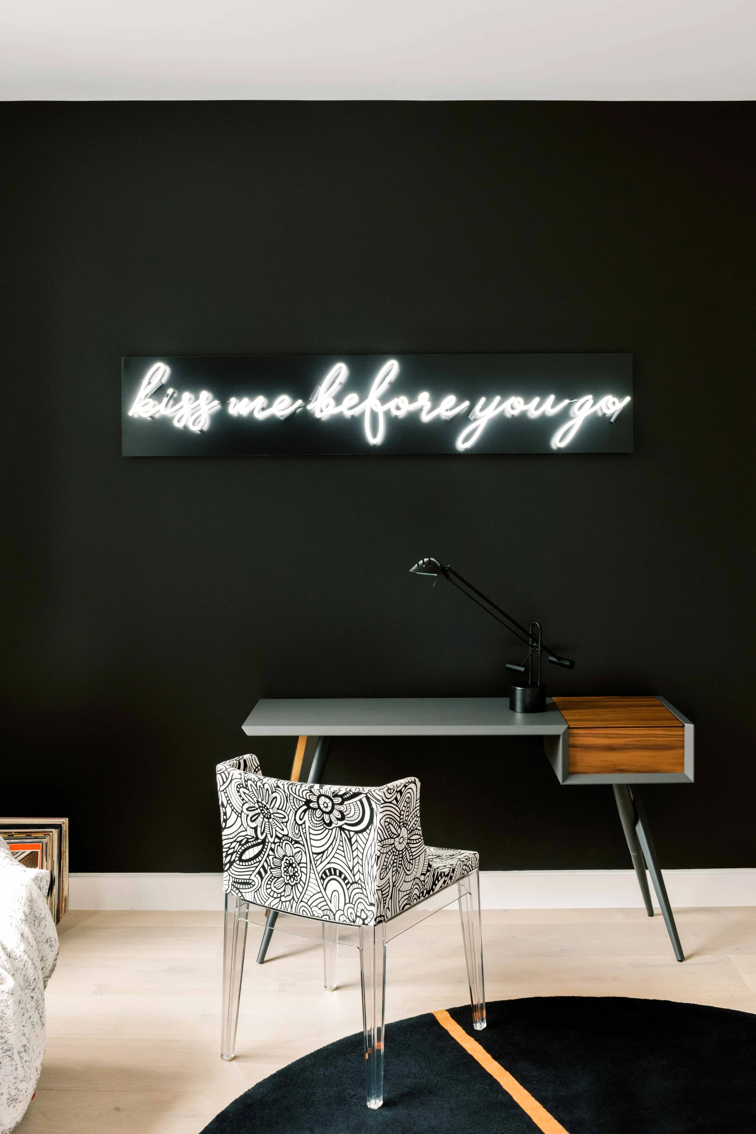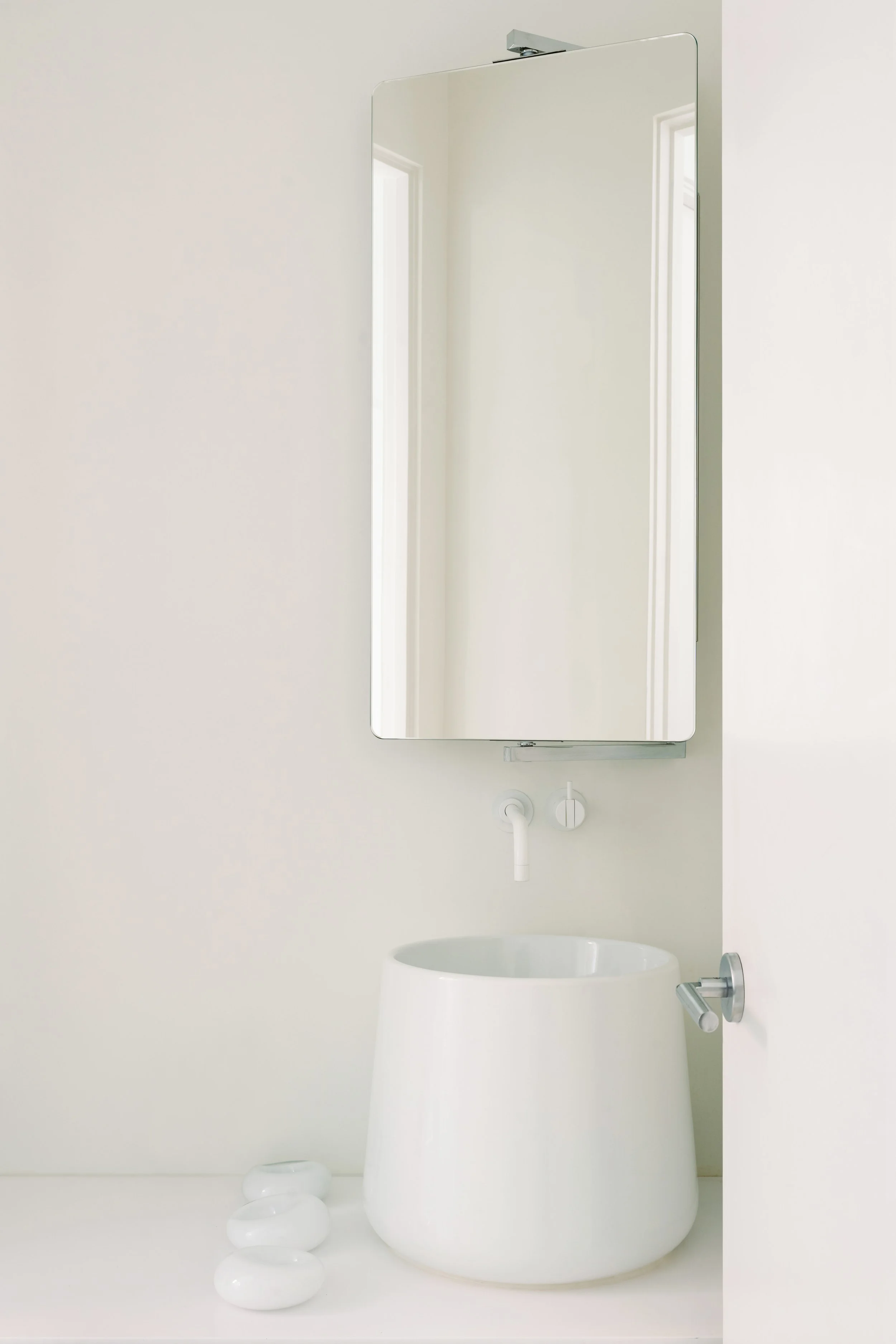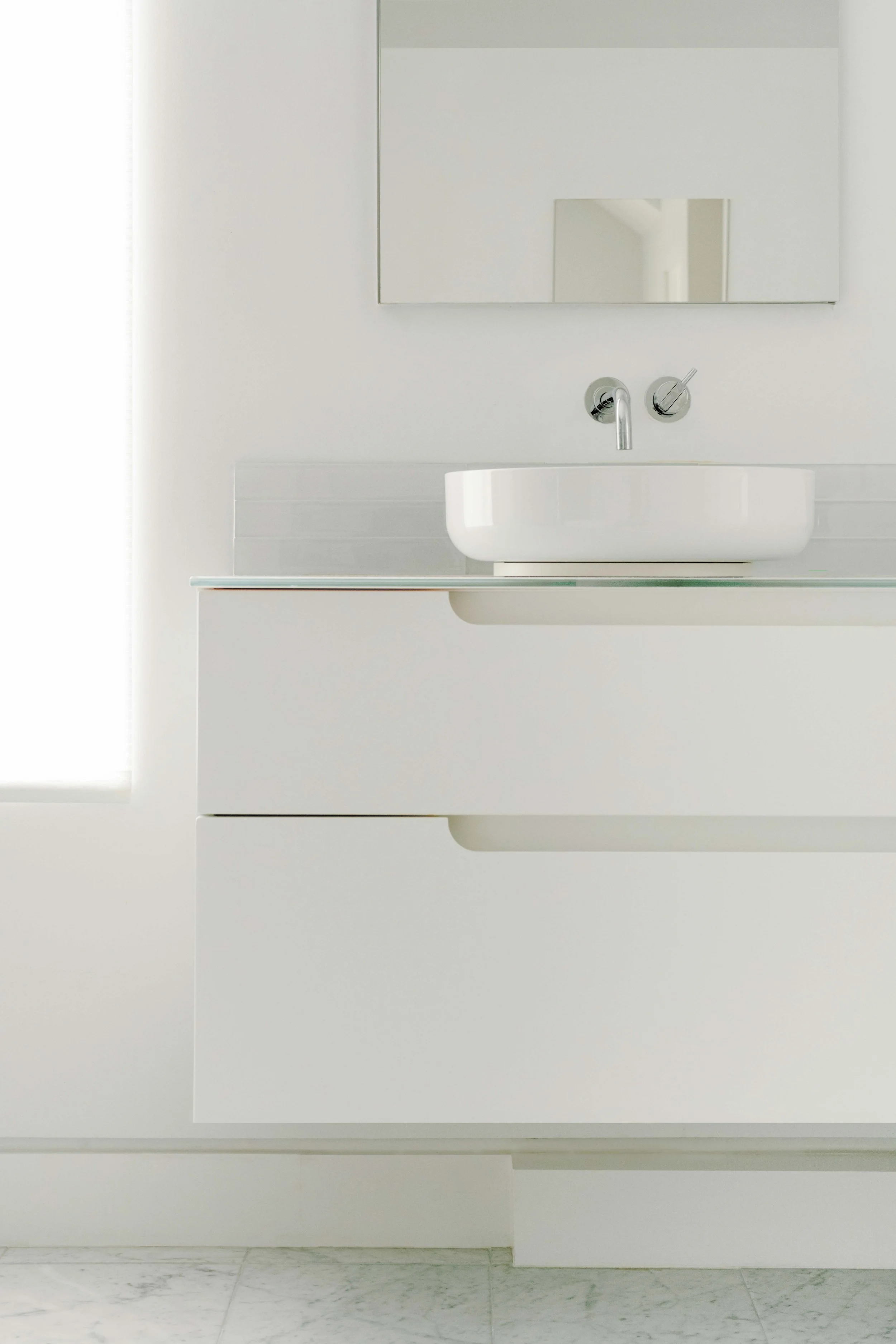 Pop Palace is a ground-up, two-year project by Lambrakos Studio to create a singular space for an art-collecting family. Our firm designed the interior architecture, selected interior and exterior finishes, fixtures and furnishings. Pop Palace is equally luxuriant as it is playful, modern as it is expressive. Color punctuates each room, in response to this adventuresome client’s fine and decorative art collection. Surrounded by crisp tones of white-and-beige, these elements ‘pop.’ Strong geometric moves provide subtle drama, played out by the scale and style of fixtures, finishes and furnishings. The custom Bulthaup kitchen delimits zones of activity — island, cooking wall, butler’s pantry — in monolithic casework. Furnishings by preeminent historic contemporaries, Eileen Grey’s Bibendum chair and Mies van der Rohe’s Barcelona bench, layer this contemporary environment — anchored by a B&B Italia sectional — with design history.