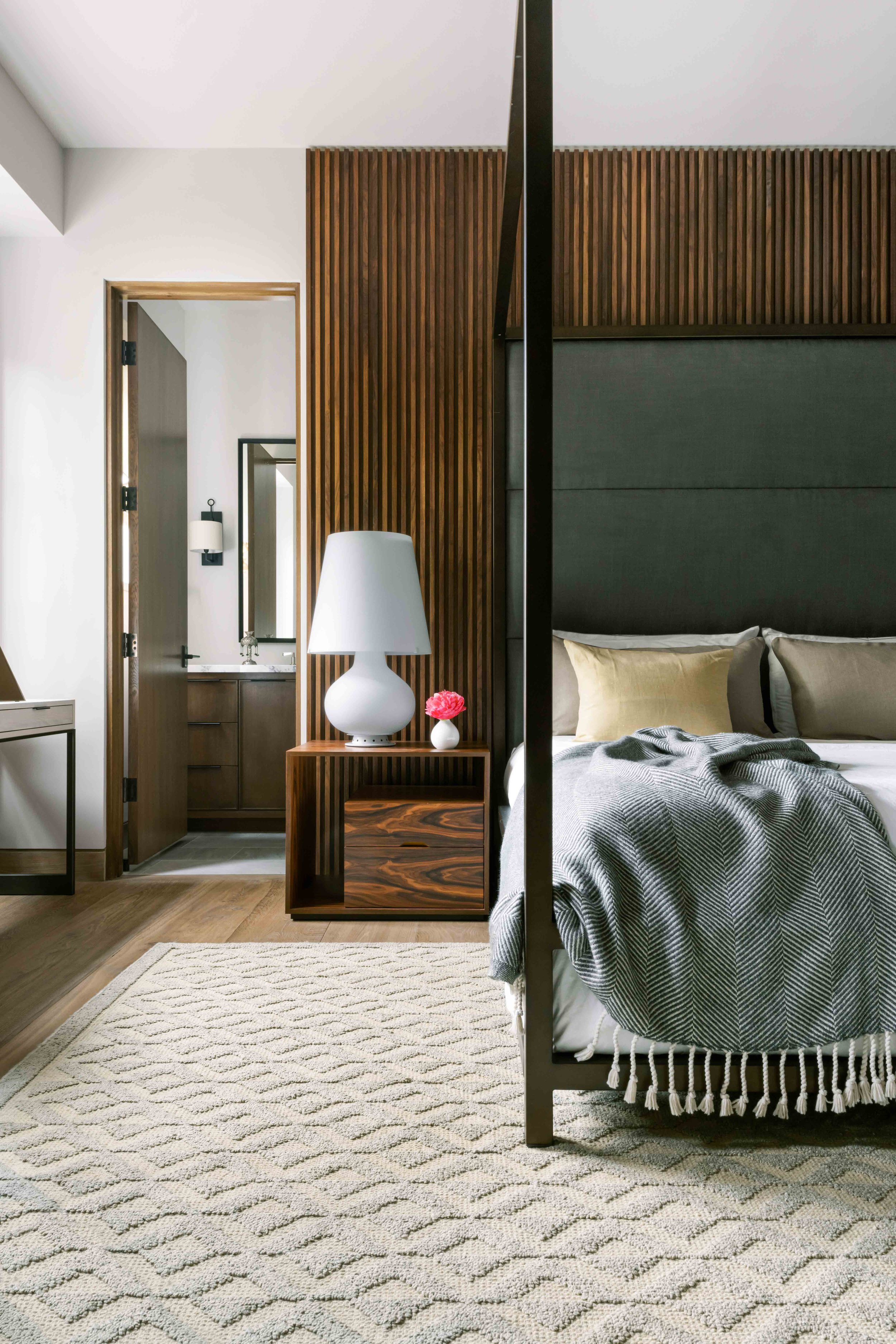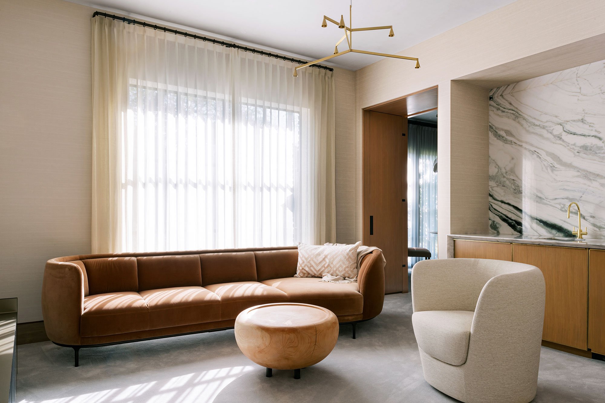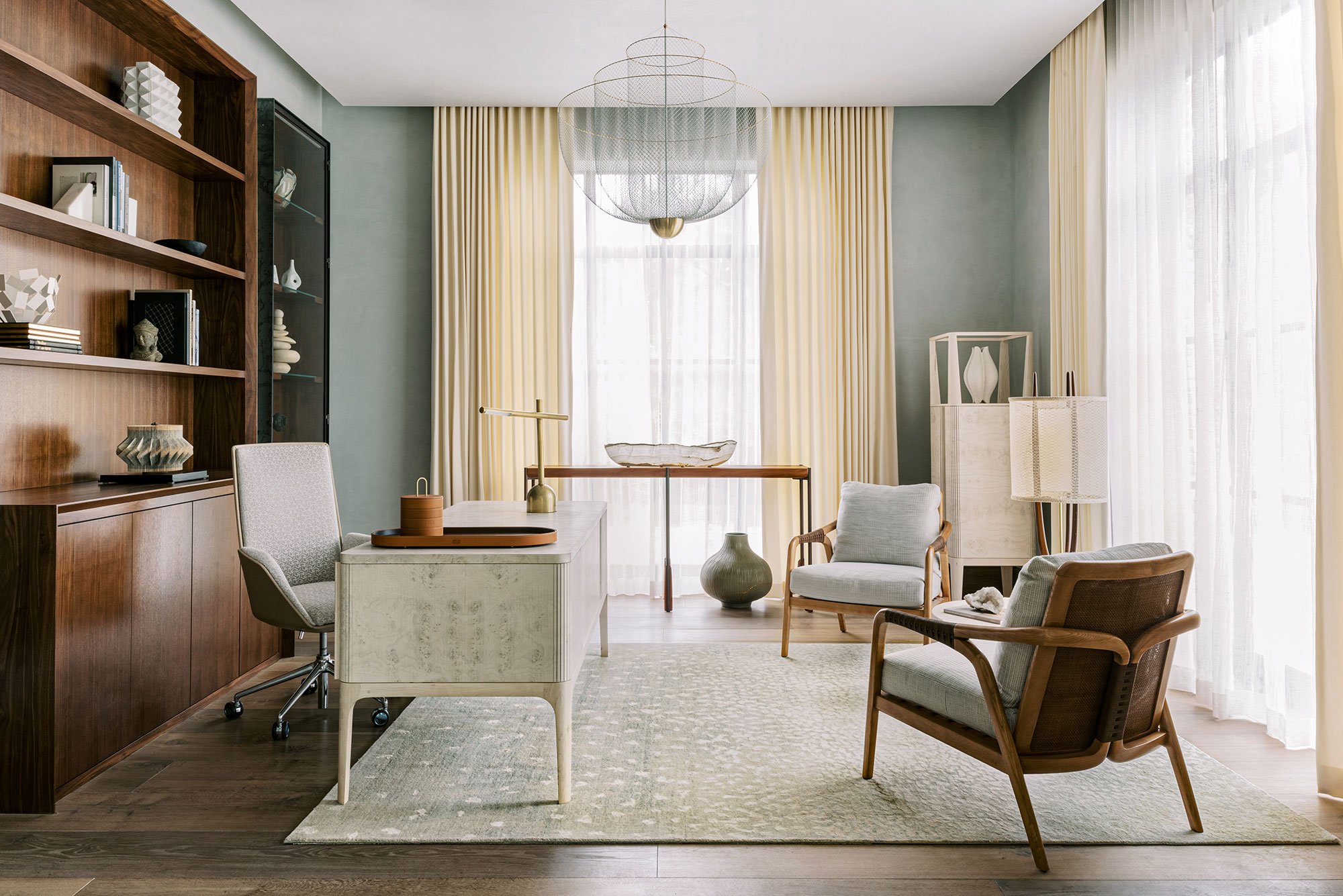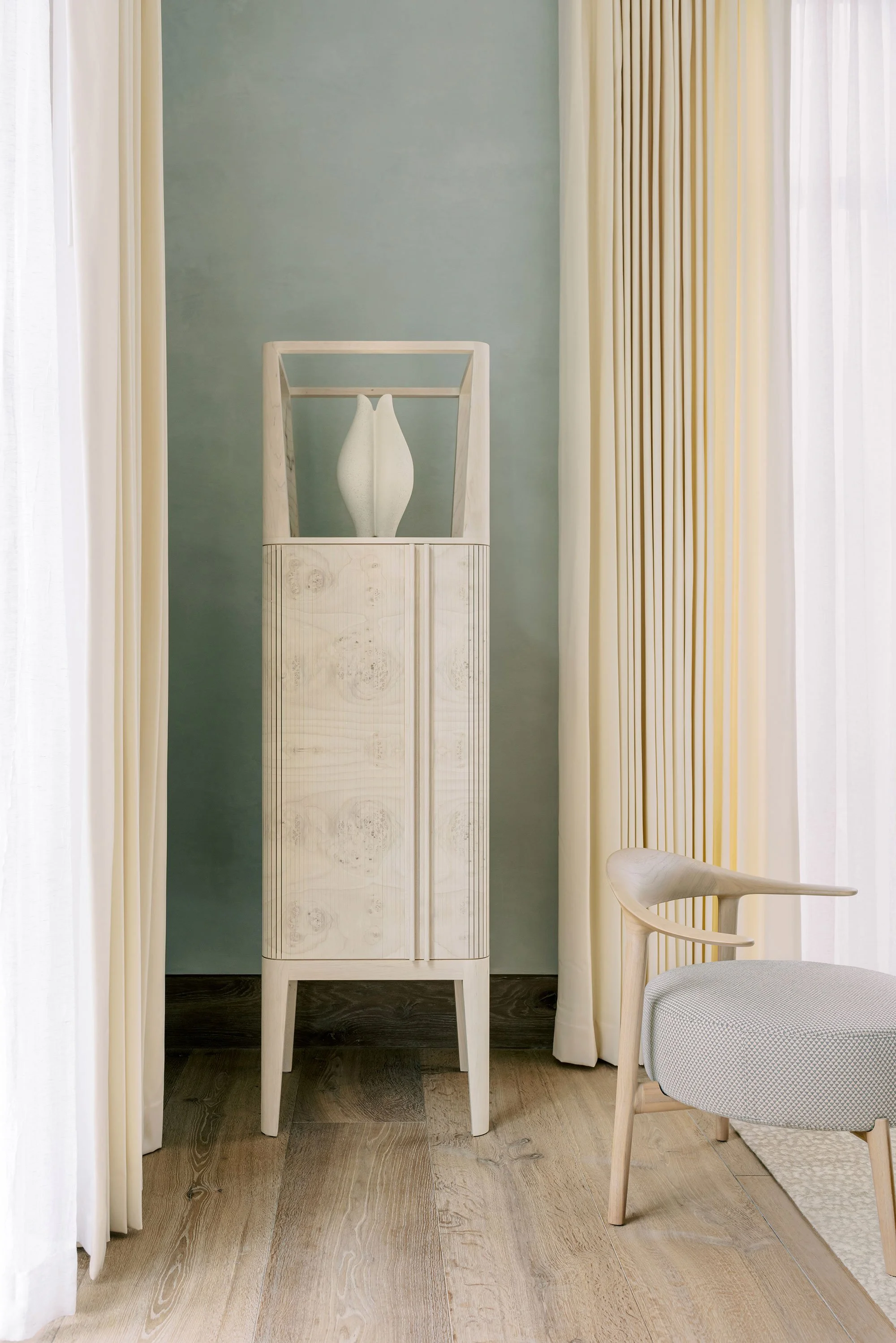 A testament to quiet and classical beauty, this is one of Reagan Miller’s final projects in Houston. These interiors honor and reinvent 20th century design to capture interiority as expansive, light-infused, and restrained, a careful play and balance of materials and form enfold luxury with simplicity. I am emboldened by artistic movements - the sumptuousness of Art Deco in the tailoring and pattern of fabrics, the streamlined forms of Modernism as shape, color and texture interweave a setting to different effect as one moves through a modular and dynamic living space, a private couplet of chairs ensconced in a cascade of silk drapes and wall covering, a sitting room suspended at the break of dawn in soft copper tones, the striated carved backdrop of a bedroom, and the transcendence of a personified study.